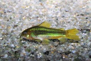 The Green Laser or Green Stripe Cory is one of the most vividly colored fish in its genus, with an unmistakable fluorescent green stripe arching across its back. Known only from the Ucayali and Maranon rivers in Peru, two headwaters of the Amazon, it is unknown what purpose this unusually bright streak of color serves in the wild but in the aquarium it makes for a remarkable display. Like most Corydoras they are active, peaceful schooling fish that will display their best colors and behaviors in a larger group.