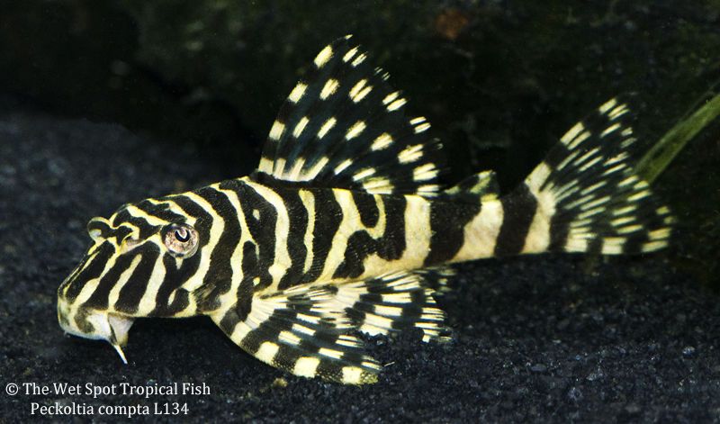 The L134 Leopard Frog Pleco (Peckoltia compta), also known as the Imperial Tiger Pleco, is a member of the Loricariidae family of South American suckermouth catfishes. Its bright yellow and black, zebra-like striping combined with its relatively outgoing personality make it a very striking fish for the planted or nano aquarium. The color of the stripes can range from a cream to a yellow color. Like many plecos, the Leopard Frog Pleco has generally been a wild-caught species, but we are proud to be among the first stores to offer tank-raised juveniles at a much lower cost than wild-caught specimens!